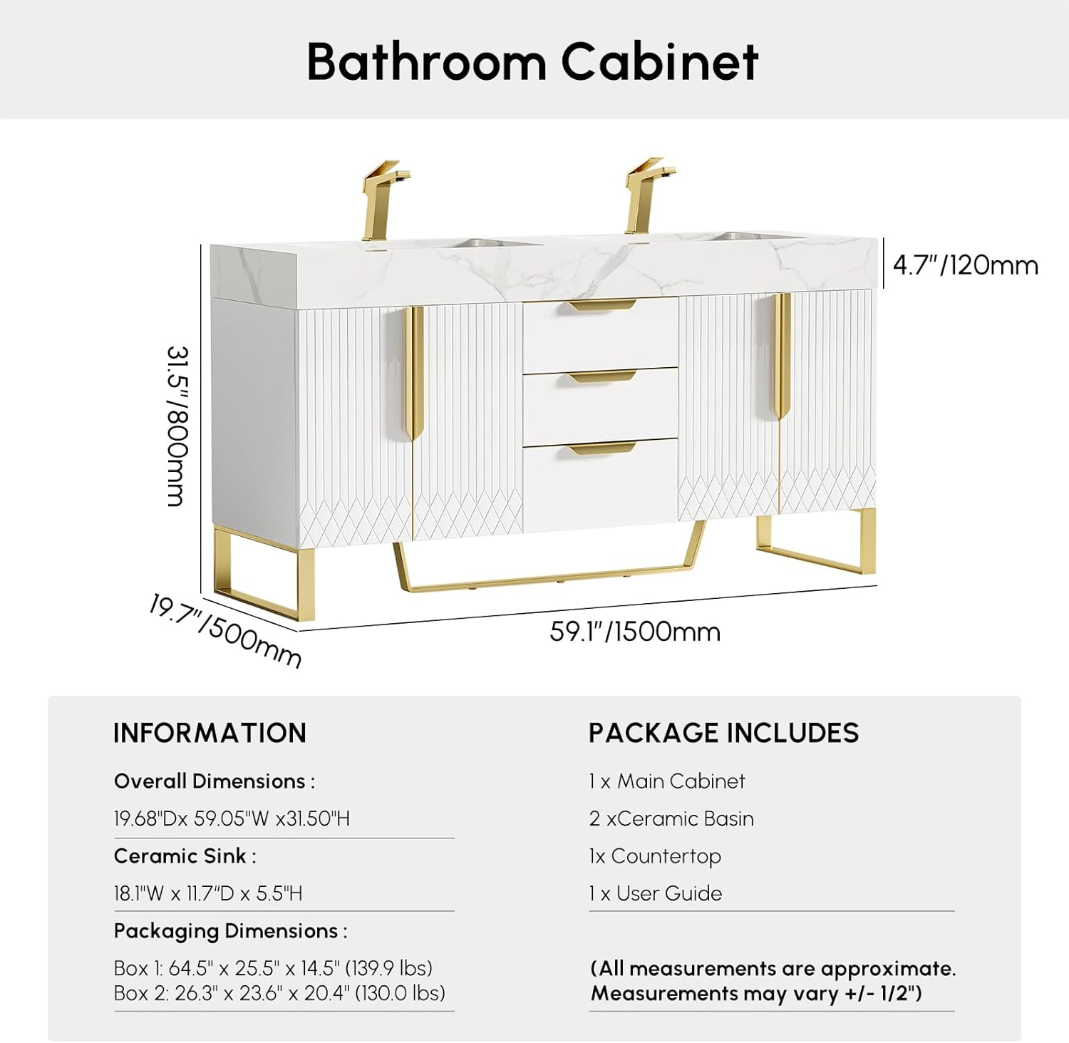 59" White Double Sink Freestanding Bathroom Vanity Modern Bathroom Vanity with Sink & Drawers & Doors Faux Marble Top
