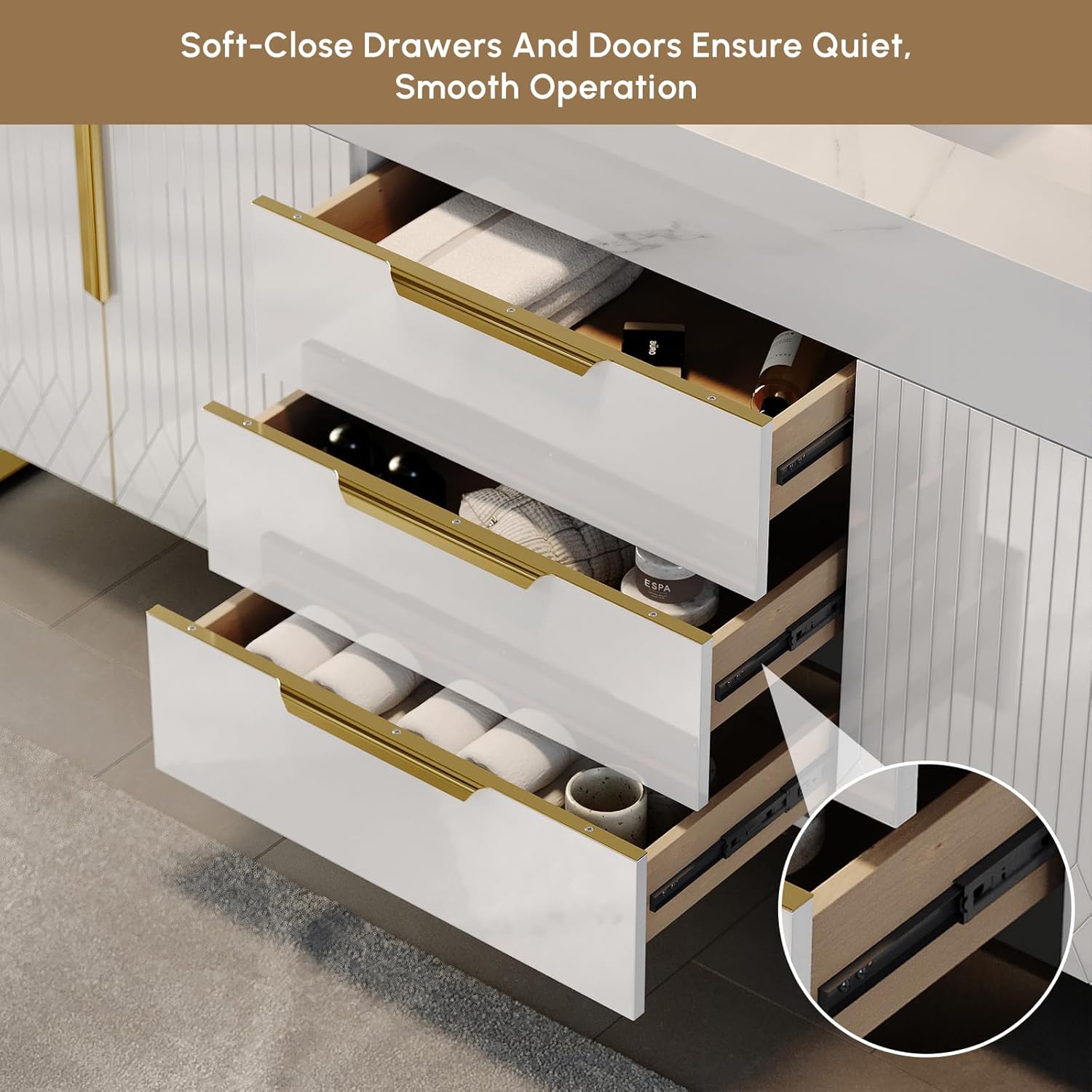Featuring a sintered stone top and double undermount ceramic sinks, it blends durability, modern design, and smart storage with 3 drawers and 4 doors.