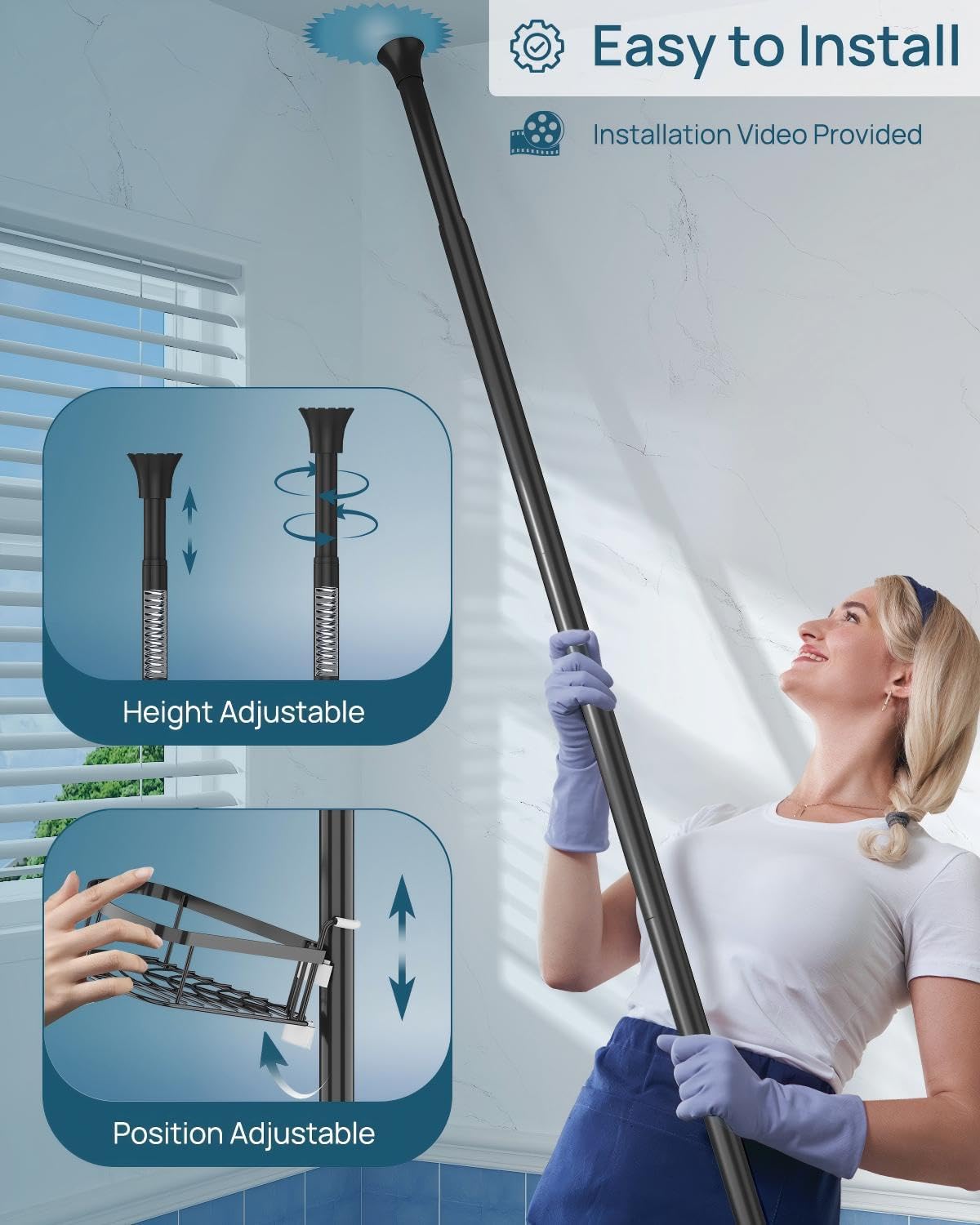 SEIRIONE Corner Shower Caddy Tension Pole, Rustproof Bathroom Shower Organizer Corner, 4-Tier Adjustable Bathroom Shelf, Solid Rack Ideal for Bathtub Storage, 34 to 116 Inch Height, Black