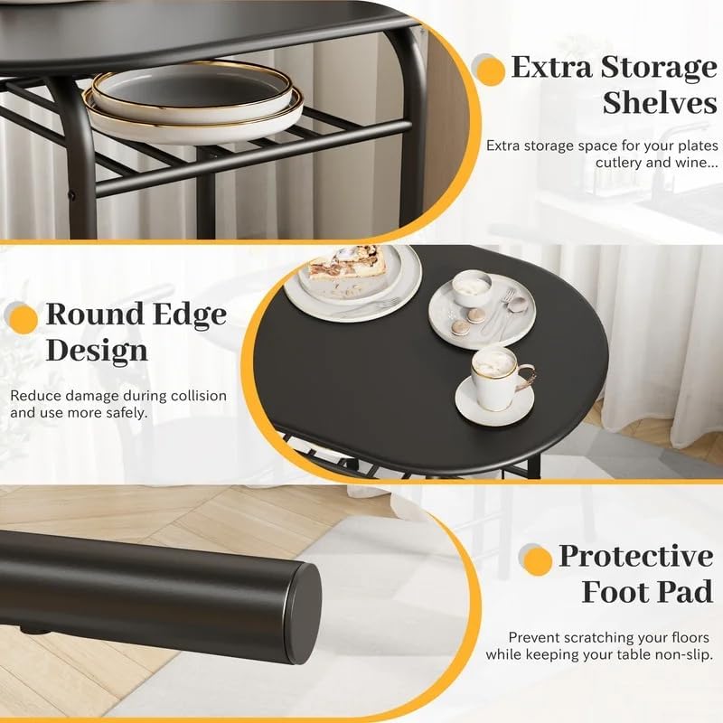 Shahoo 3-Piece Wooden Dining Table Set, Kitchen Breakfast Nook Sets with 2 Chairs & Round Tabletop, Space Saving Furniture Metal Frame and Built-in Wine Rack, Black