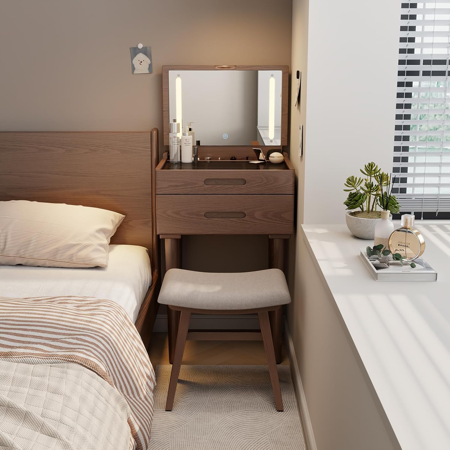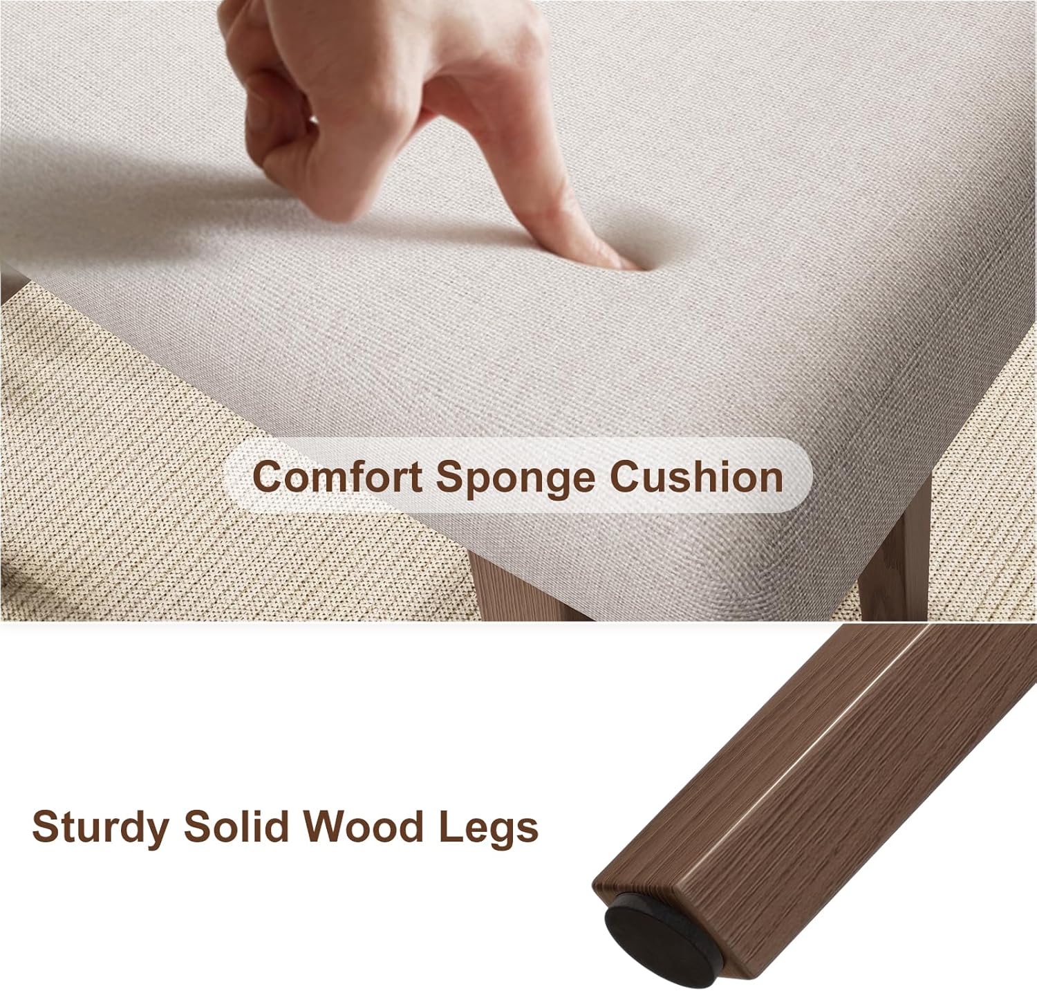 Solid Wood Small Vanity Stool, Compact Makeup Chair with Saddle Cushion, Linen-Covered High Rebound Sponge Seat, Easy Assembly Footstool for Bedroom, Entryway, Home, Walnut