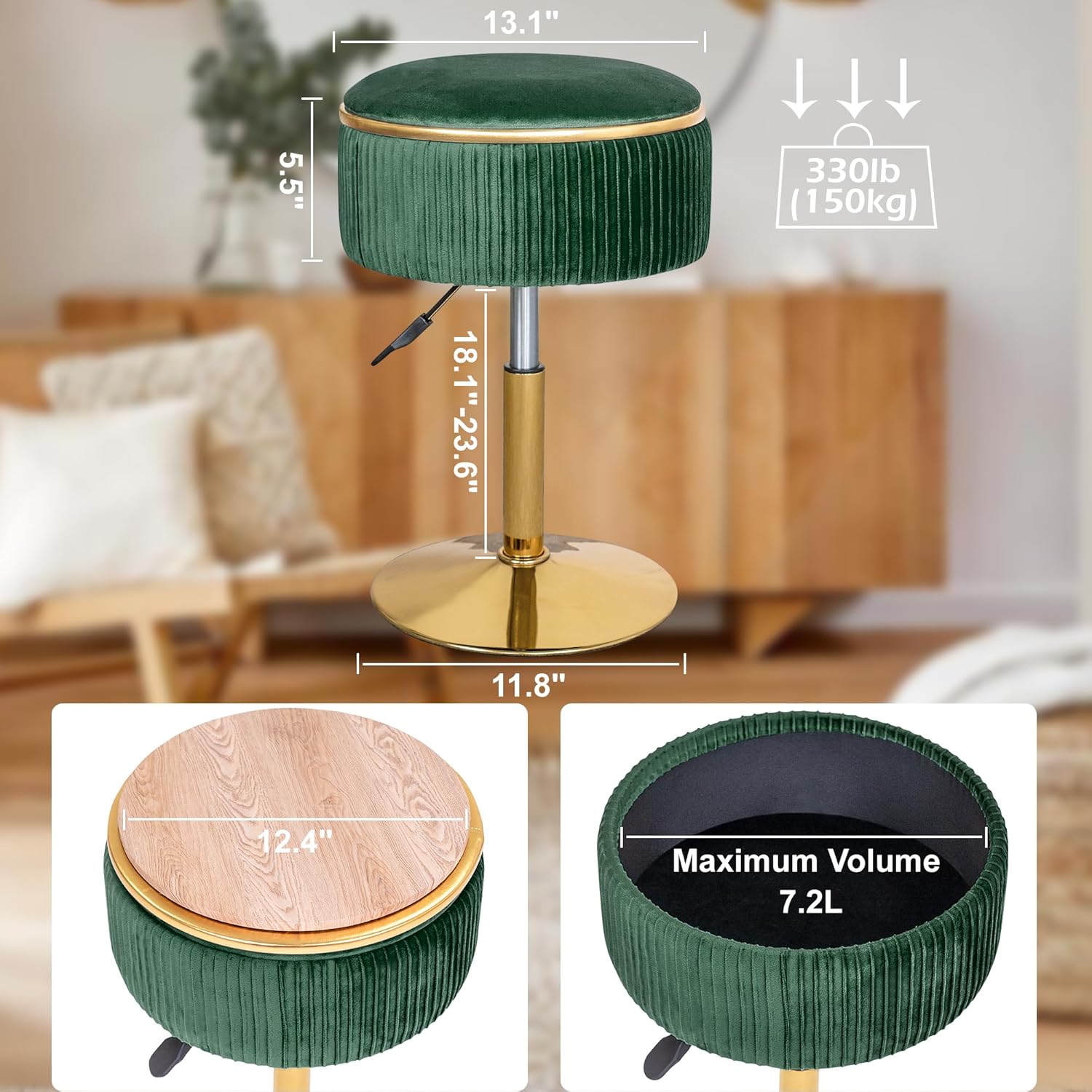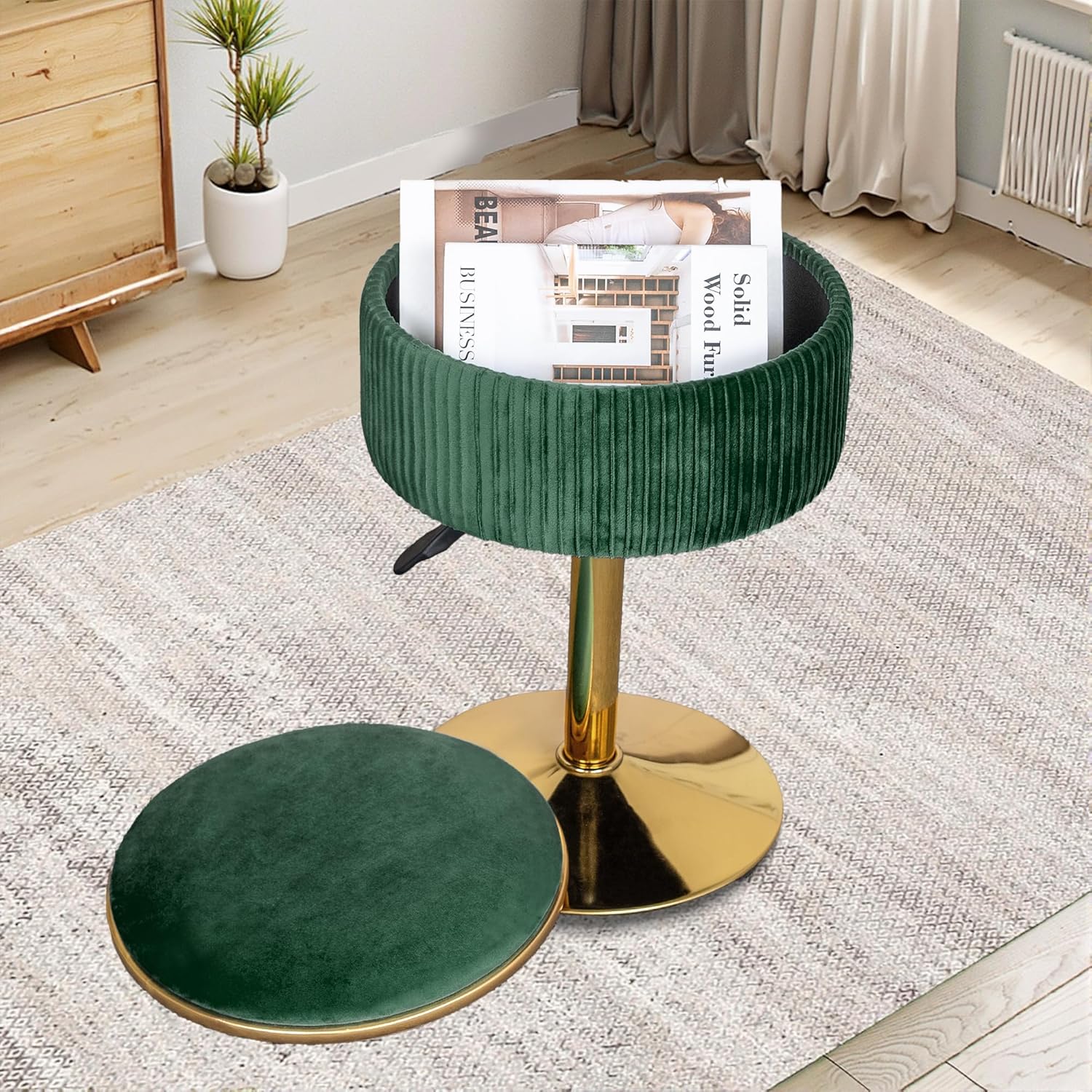 Velvet Vanity Stool for Makeup Room, Round Storage Ottoman Height Adjustable Gold Vanity Chair, 360° Swivel Footrest for Living Room Bedroom, Dark Green