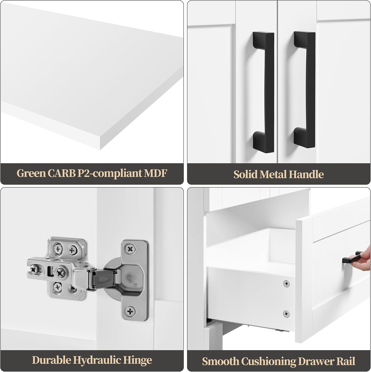 - Constructed from CARB P2-compliant MDF, it comes with a freestanding ceramic sink for enhanced durability.