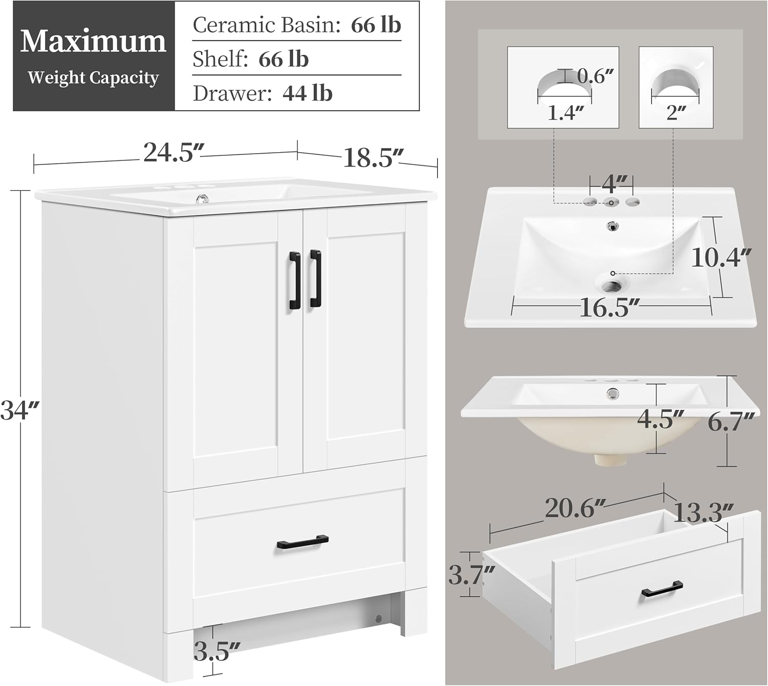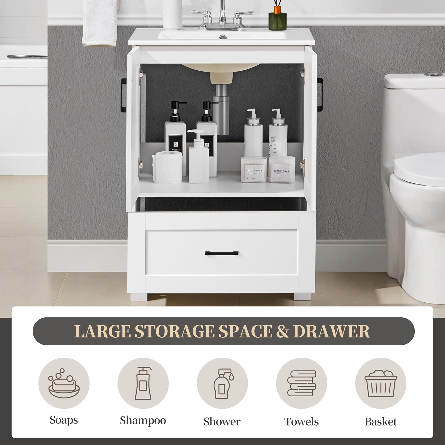 Yaheetech 24.5" Modern Bathroom Vanity with Ceramic Basin, Undermount Vanity Sink Cabinet with 2 Doors and 1 Drawer, Free Standing Bathroom Storage Cabinet with Sink Combo Set, White